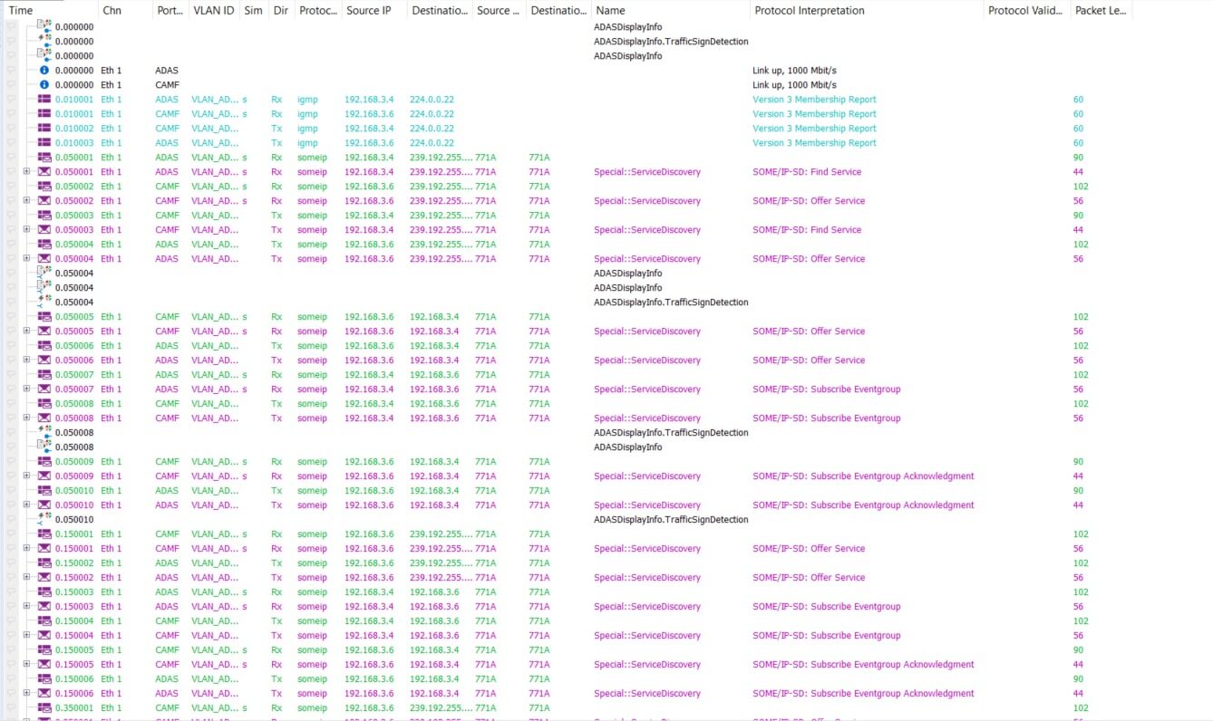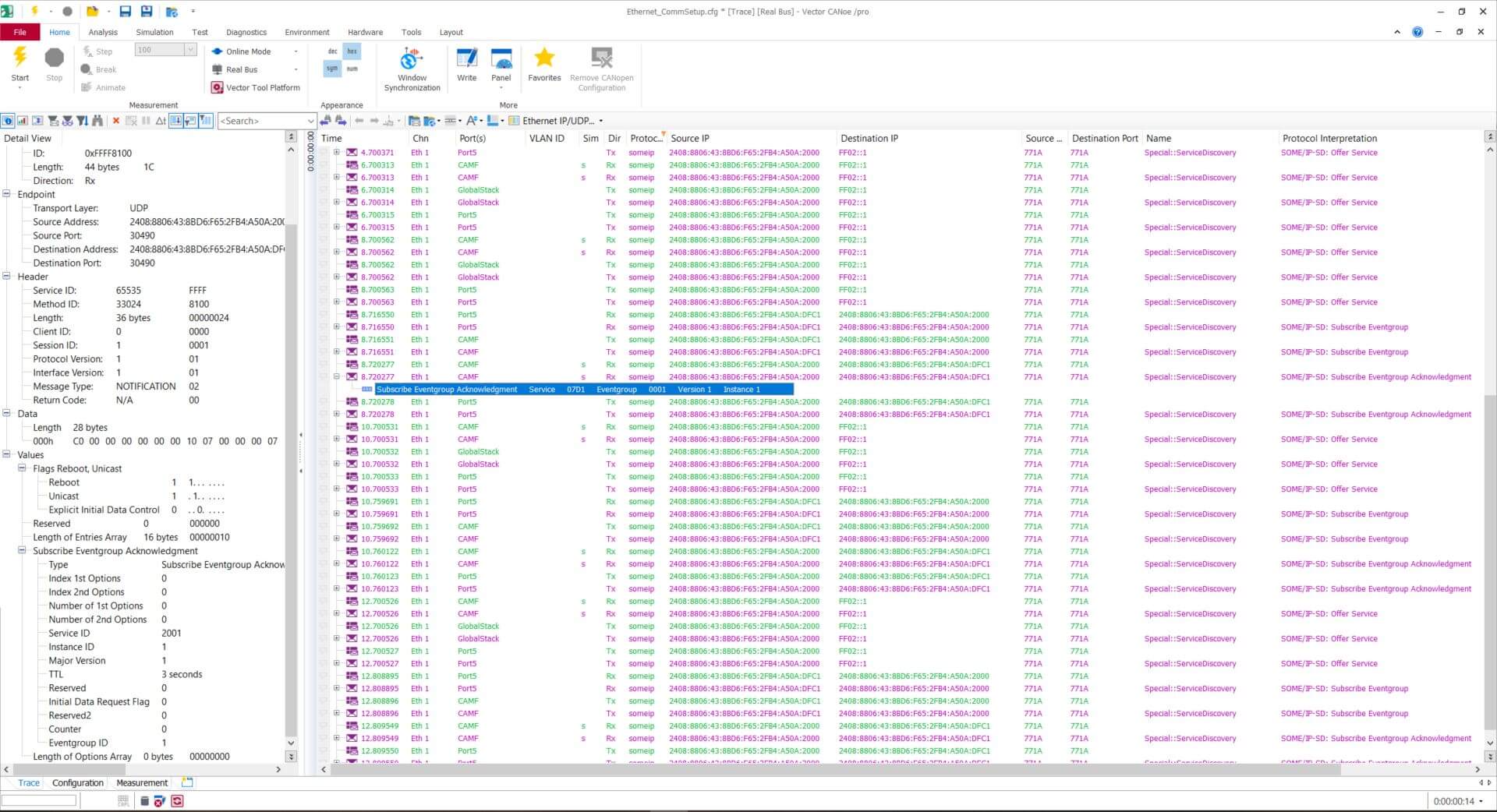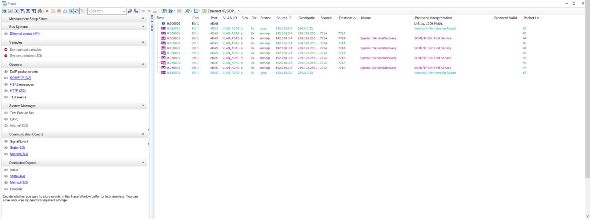 现在看到已经有了Service Offer、Service Find、Subscribe Event group 以及Subscribe Event group Acknowledgment的报文了。这些步骤是CANoe的SOME/IP协议栈自动完成的,由于没有具体业务逻辑,目前没有具体的数据发送的Trace。