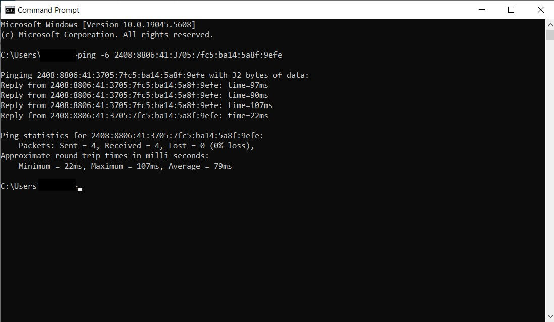 接下来我们尝试一下与真正真实的设备链接的情况,我们用一台电脑运行CANoe的CAMF的Provider端,然后另外一台电脑使用vsomeip库运行一个Consumer端,两台电脑用路由器连接,为了更加贴近真实项目我们换用IPv6地址。首先看下本机的IPv6地址为2408:8806:41:3705:6b08:9188:eae4:268f,另外一台Linux主机的IPv6地址为:2408:8806:41:3705:7fc5:ba14:5a8f:9efe,本地尝试一下能正常ping通。