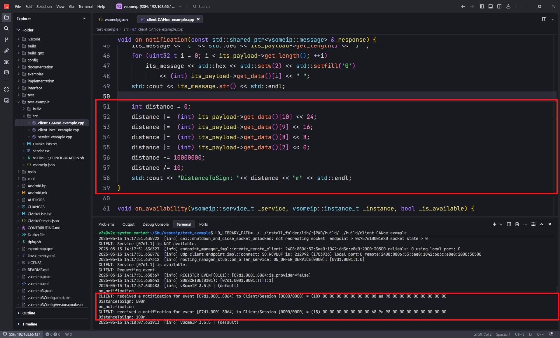 下边截图和上边相同时间,我在Consumer即ADAS端截取的Trace。前文提到了SomeIP定义了很多支持的数据类型以及序列化方式,以及AUTOSAR框架下会用到很多Autosar额外的表示方式,Distance这个值使用了SOME/IP的UInt32数据类型,又结合了AUTOSAR支持的Linear数据结构,设置了Offset和Factor分别为-1000000和0.1,单位为m,这一块不适于SOME/IP协议的部分而是AUTOSAR的部分,所以在vsomeip库中并不是直接支持,我手动写了一部分做了物理值和总线信号的转换,下方截图打印出了总线原始值和我转换后的物理值,可以看到我们刚才在CANoe中触发的Event Notification已经成功在另外一个设备中收到并解析成功。