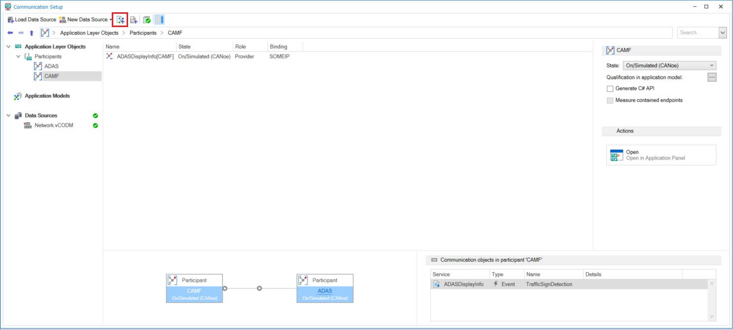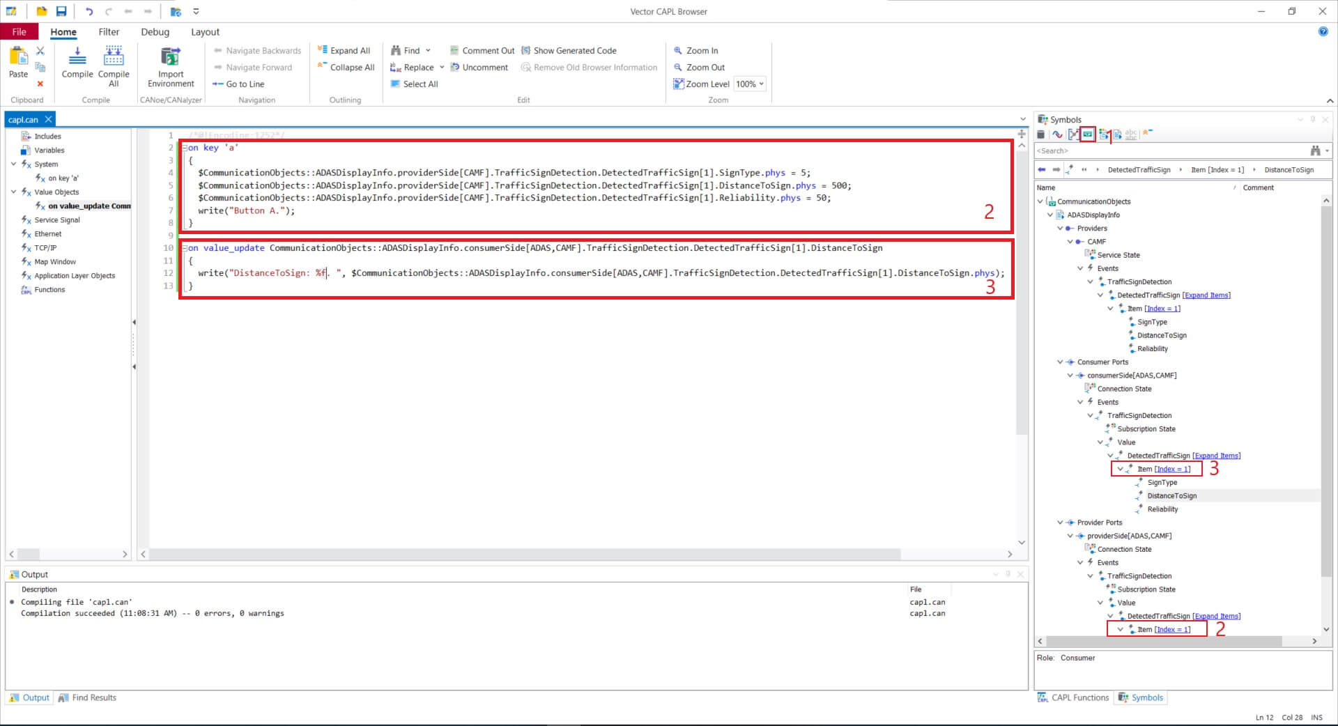 然后我们设置一个最简单的参数修改,仿照之前我们修改DetectedTrafficSign的第二个Item,首先下图按钮1切换到Application Layer Objects,这里列出的所有Provider和Consumer的结构体数据,但是通常情况下对于Consumer是只读的,我们能更改的是Provider的数据。我们在这里做一个最简单的演示,即在Provider将DistanceToSign设置成500,然后检测Consumer有无收到,若收到则打印到调试窗口,如下图代码。