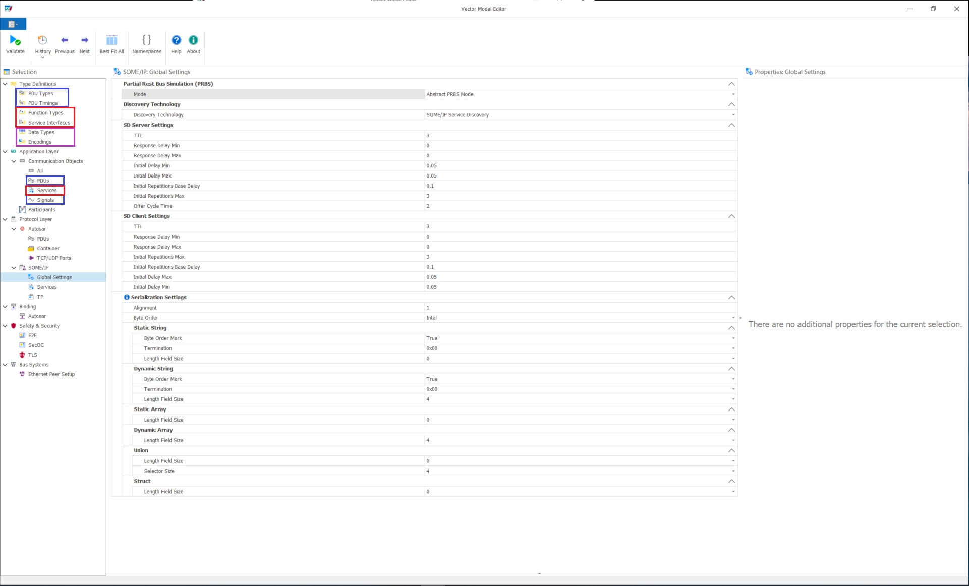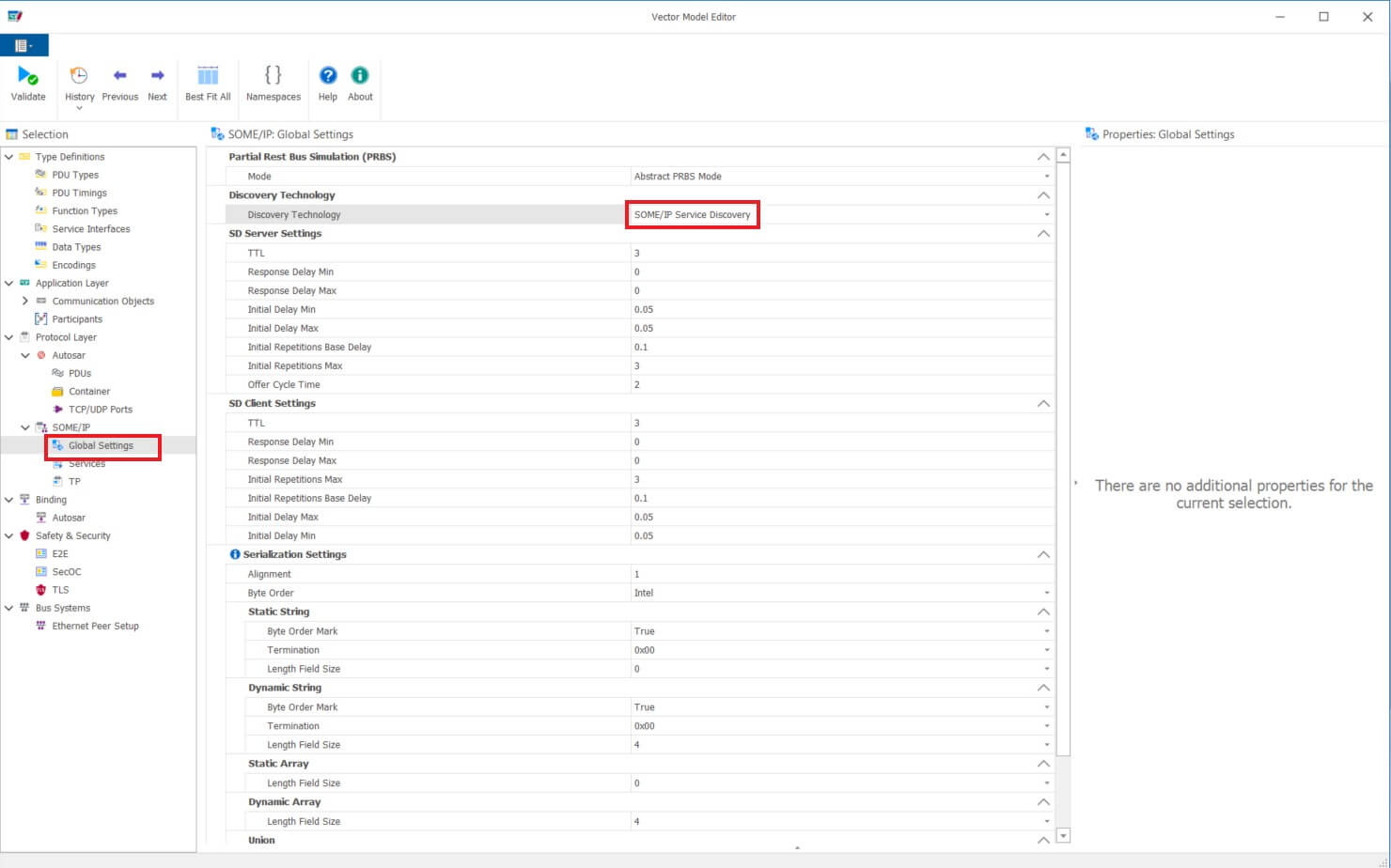 首先这个截图的页面停留在的是SOME/IP的Global Settings,这里的配置是对于SOME/IP协议的一些基础数据进行配置的,其中有一些是关于SD服务发现,一些是关于数据结构以及序列化相关的配置。这些内容应该是软件架构系统架构层面来定义,到达功能层面基本上用不到在这里有设置。除非是对于自己在这里的更改非常清楚在做什么,其他情况我们一般不需要改动这里的内容。