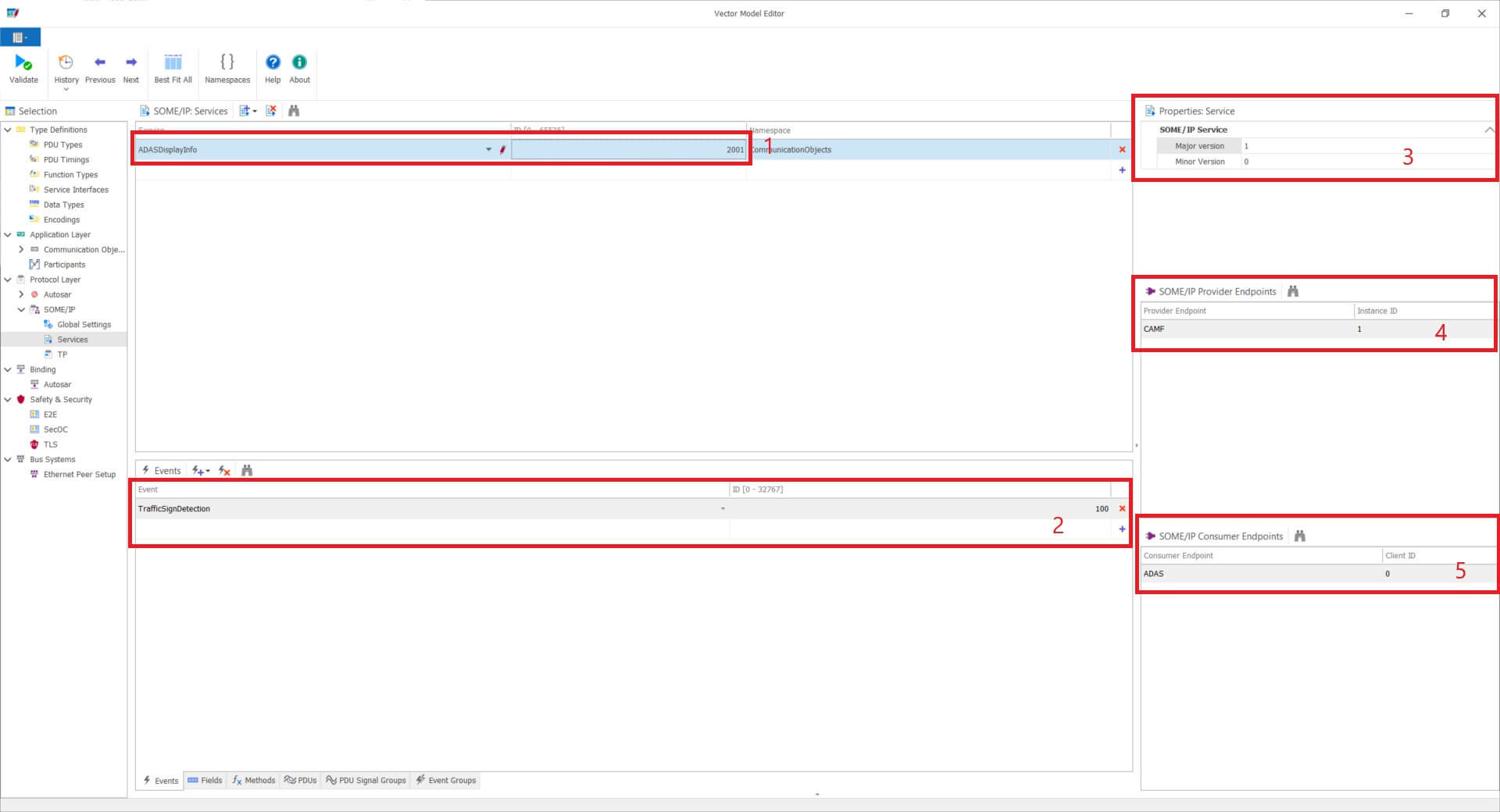 到目前终于一起看完了传输层的配置,终于开始看SOME/IP自己特有的协议配置了。在SOME/IP 下Service页面,下图中框1中终于可以看到,我们在这个示例数据库中,一直在用的Service的名称是ADASDisplayInfo,Service ID是2001,从框2看到这是一个Event类型,Event ID是100。右边的框3、4、5设定了SOME/IP Service 的Major version, Minor Version,以及Instance ID 和Client ID,这些对应的Some/IP在头部数据的位置,从前边的介绍中都能找到。