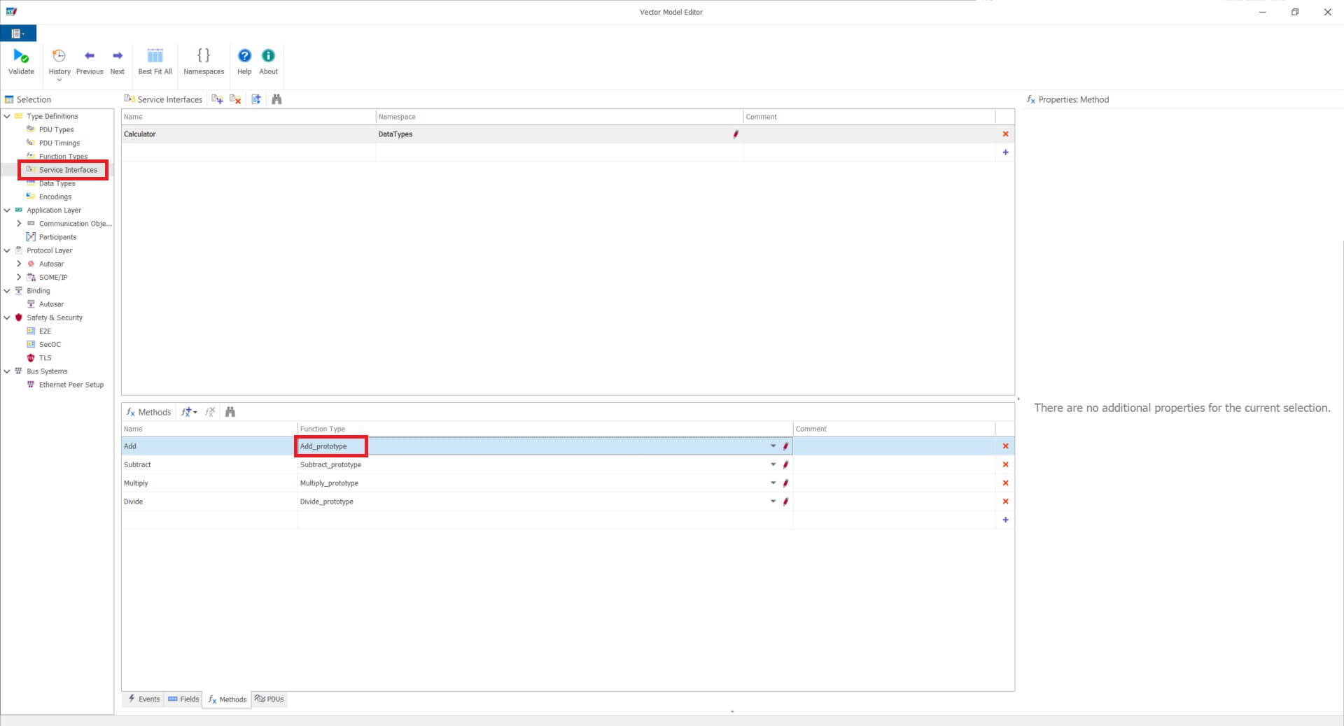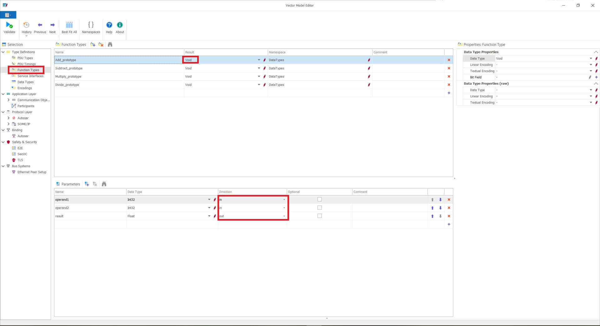 关于Service用到的数据类型还有一个Function Types,这个可以理解成定义了很多基础的Function功能调用,包括传入传出参数什么的。然后在SOME/IP的Method方法可以选择使用那个基础Function功能,从而实现远程调用。在目前的这个示例数据中没有用到,如果想了解的话可以使用CANoe另外一个名为SOABasicAsrAdaptive的例程数据库,很清晰明了的,如下图。