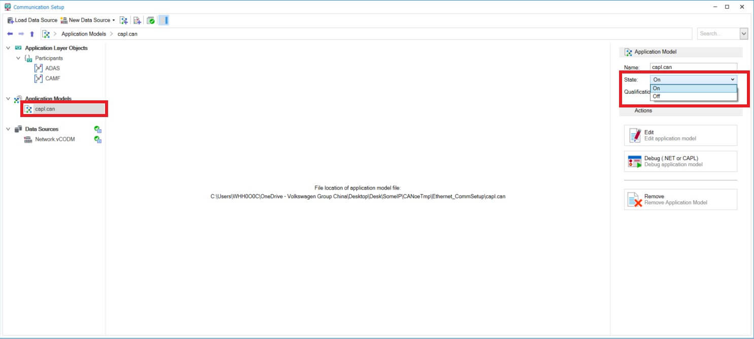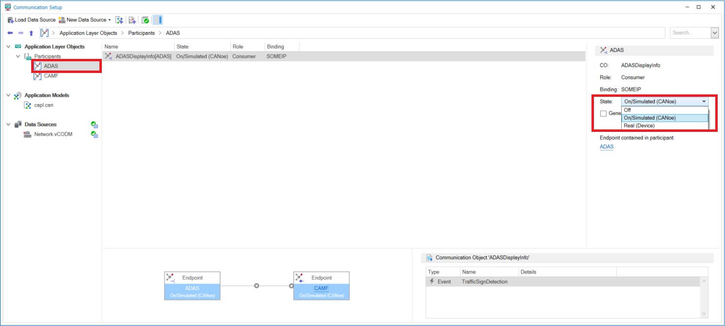 在实际的应用中,通常我们需要CANoe来仿真Consumer或者Provider一端,我们看下假设只有一端节点的情况,先在Communication Setup将ADAS切成Real(Device)状态,开启运行我们看下Trace窗口。这时需要将Application Models中的CAPL禁用掉,因为其中的一些函数在真实节点下已经不能调用了。