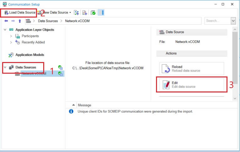 刚才的例子通过配置自动SD服务发现,这样开始仿真即实现了服务订阅,然后通过CANoe的功能,即解析了数据库后自动帮我们生成了Application Panel,从而我们手动触发了一个Notification,实现了最简单的一个SOME/IP通信例程。接下来我们看下我们刚才到底是仿真了一个什么服务。在最上边Communication Setup框3 按下Edit按钮,即我们配置自动SD服务发现的地方,我们看下这个示例数据库详细的数据配置: