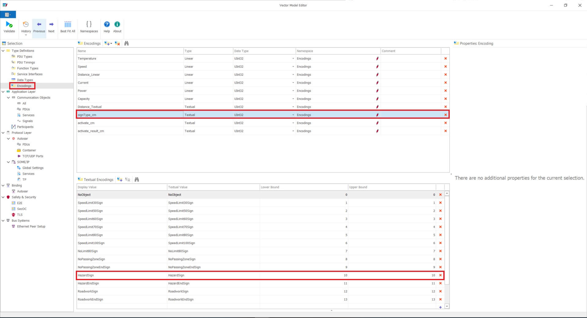 以刚刚我们用Panel模拟发送的SignType: HazardSign, DistanceToSign: 400以及Reliability 80为例,由于是层层嵌套,我先介绍一下最基础的数据类型定义,在Type Definitions 中的Encodings这一栏中,可以看到SignType_cm使用了SomeIP协议的UInit32数据类型,然后结合了AUTOSAR支持的数据结构,使用了Textual模式使用其中的0到13并赋予的一个名字,在工具结合数据库解析后,我们就可以知道对应的是哪个交通标识了。