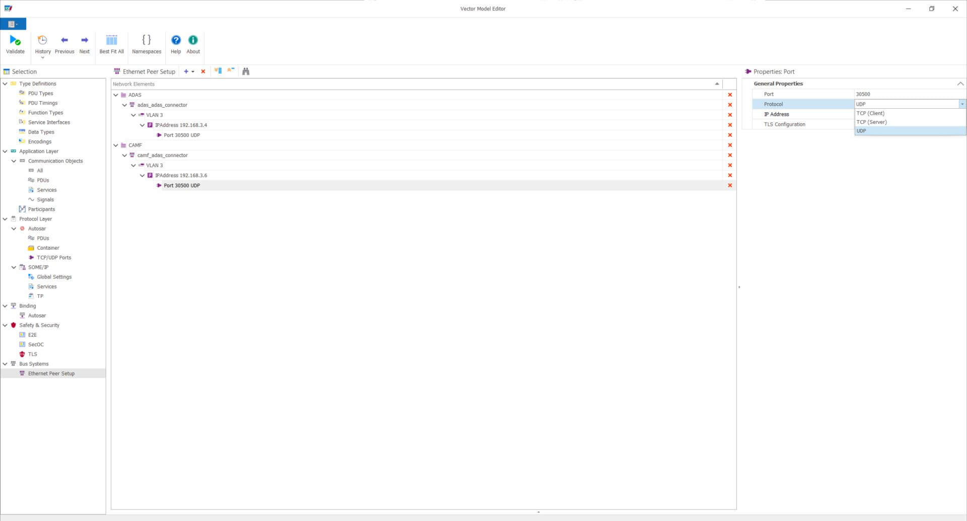 在这个Vector Model Editor中,可以配置绝大部分的AUTOSAR数据在车载以太网传输的内容定义。上图中蓝色框是PDU方式传输所用到的定义配置地方,这样的传输方式和CAN总线报文非常非常的形似,只不过将报文封装如以太网UDP的Payload中,按照UDP方式在以太网中传输。其中Signals可以理解成CAN总线的Signal,PDUs理解成CAN总线中的Message。在此将传输层将CAN总线换成UDP/IP,上层的数据格式内容等没有任何区别。