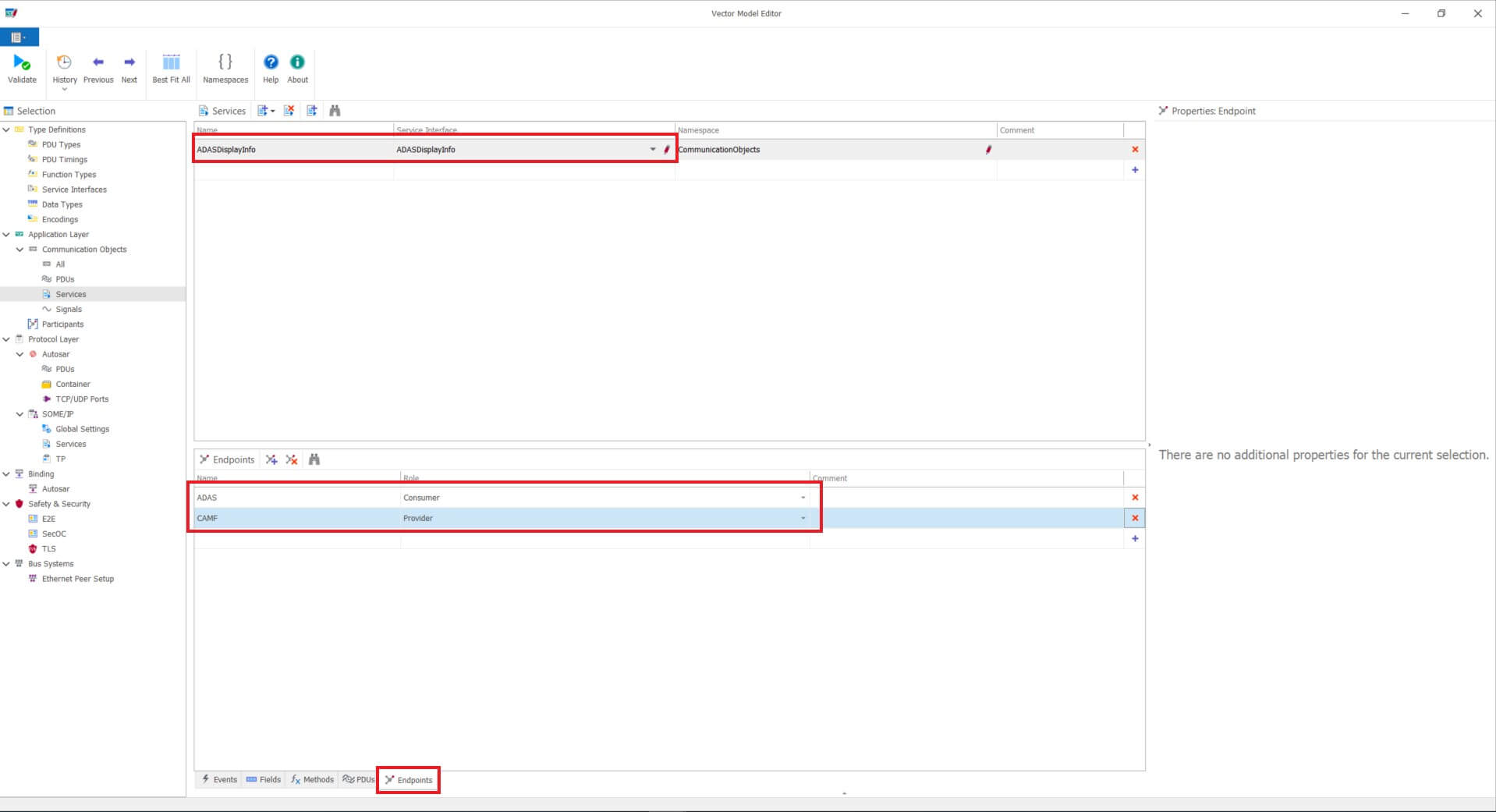 再网上看,到了Application Layer 的Services这一栏,我们的正式Service的名字(ADASDisplayInfo),以及用到的Service模板(ADASDisplayInfo,模板是可以复用的),以及其义了相关节点的名字,还有对应额角色,是Consumer还是Provider。