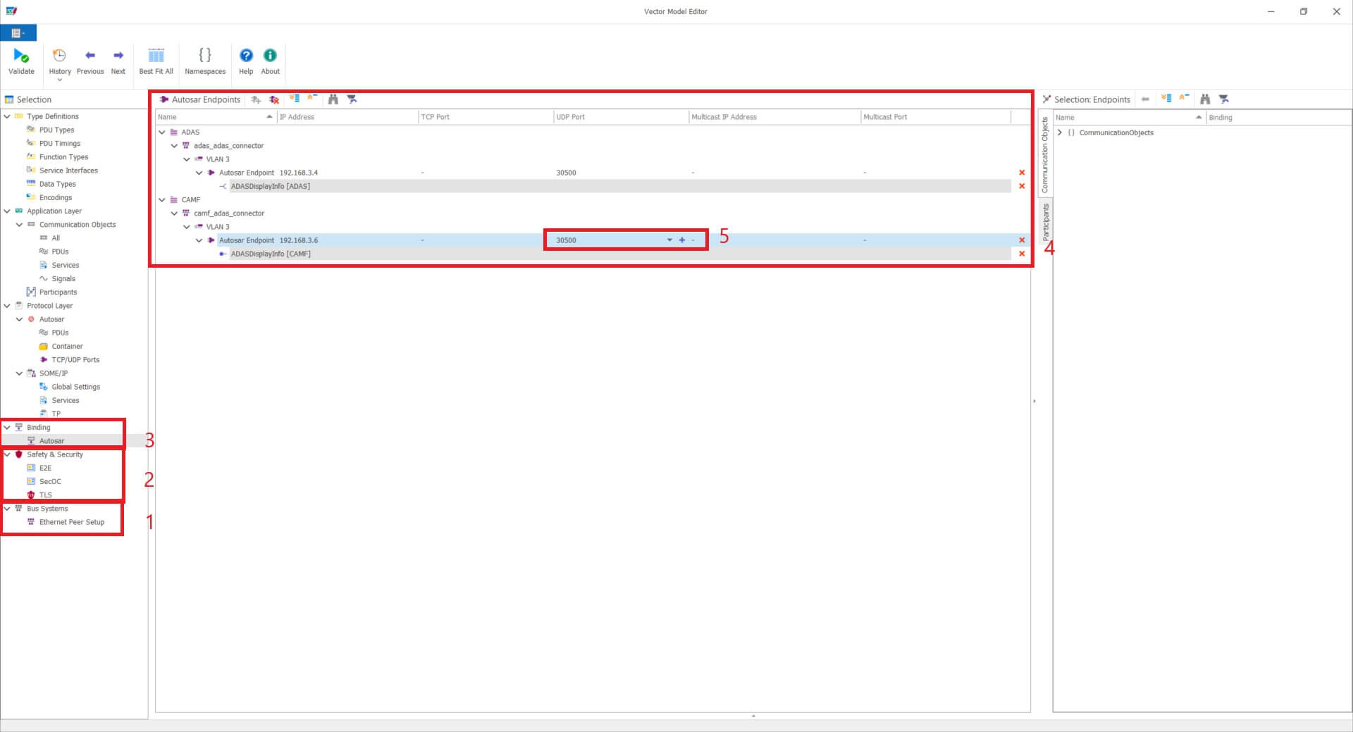 框3 是真正给SOME/IP节点配置下层依赖协议的地儿了,如上边截图的4和5,在这里可以添加要用到的IP协议,以及端口,通过小三角下拉框的形式,选择在框1中配置过的数据,实现给上层SOME/IP节点配置下层依赖。