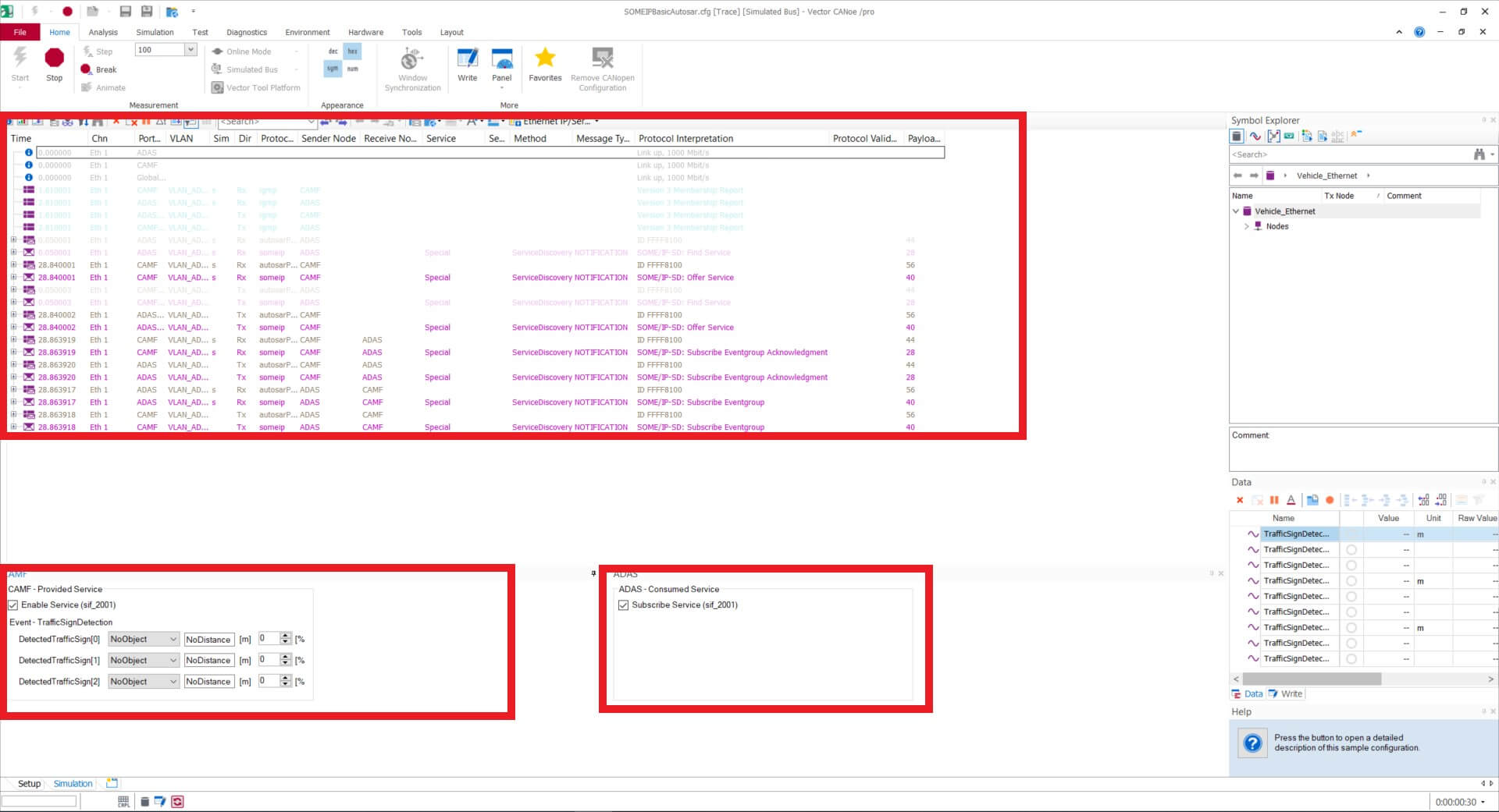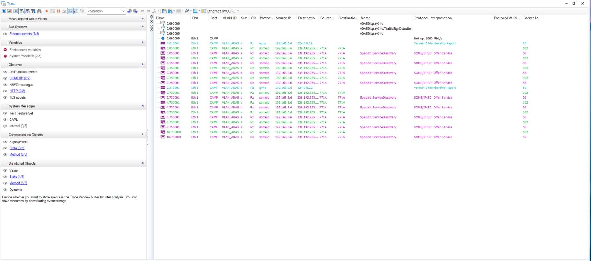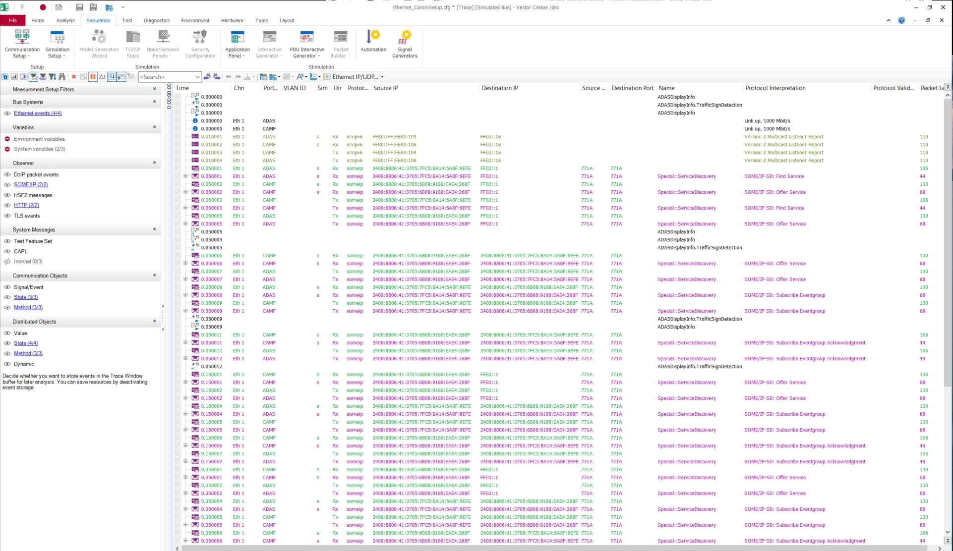 这个样例是使用Simulation Setup模式结合了一个ARXML创建的,已经有了很好的Pannel,对于我们学习Simulation消息订阅很方便。在下边两个框CAMF和ADAS,我们可以点击Enable Service或者Subscribe Service, 从上边的Trace窗口可以看到对应的服务端、客户端相应的Offer Service、Find Service、Subscribe Event group以及Stop Subscribe Event group的报文。
