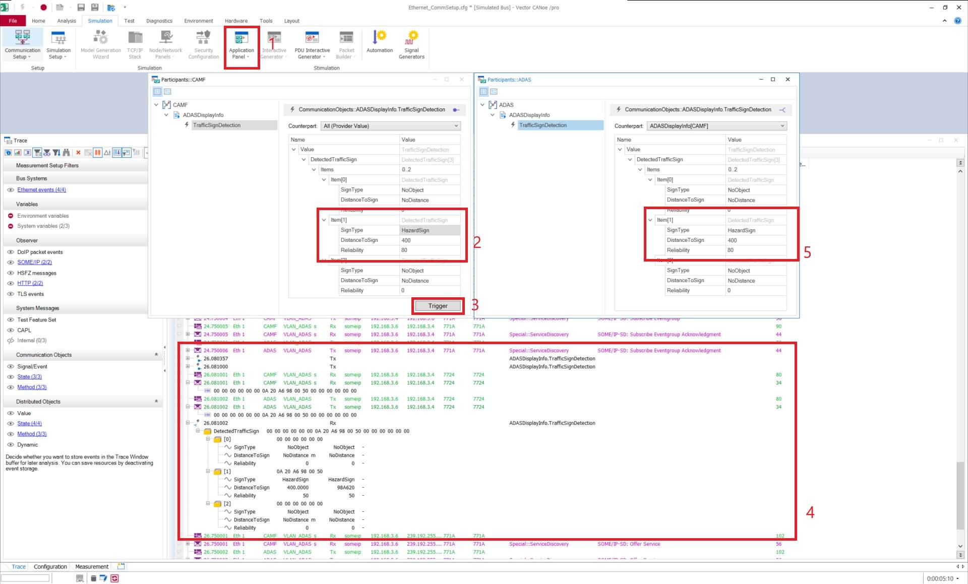 我们尝试一下加一些具体数值,在CANoe原始示例工程我们可以使用模板制作好的Pannel,现在我们新生成的空白工程没有了,那么我们就用CANoe自带的在Communication Setup下的Application Panel做一个简单的信号触发。首先点击下图1,打开两个panel,在Server端即CAMF我们填入一些信息,比如说如下图在框2填入一个交通标志的信息,点击框3的Trigger,这样Provider就会发送出一个Notification,我们从框4中可以看到相应的Trace,经过了CANoe对Trace的解析后可以看到我们触发的内容,同时在框5可以看到Consumer中更新了最新的值了。