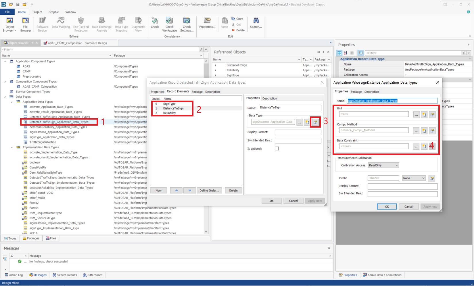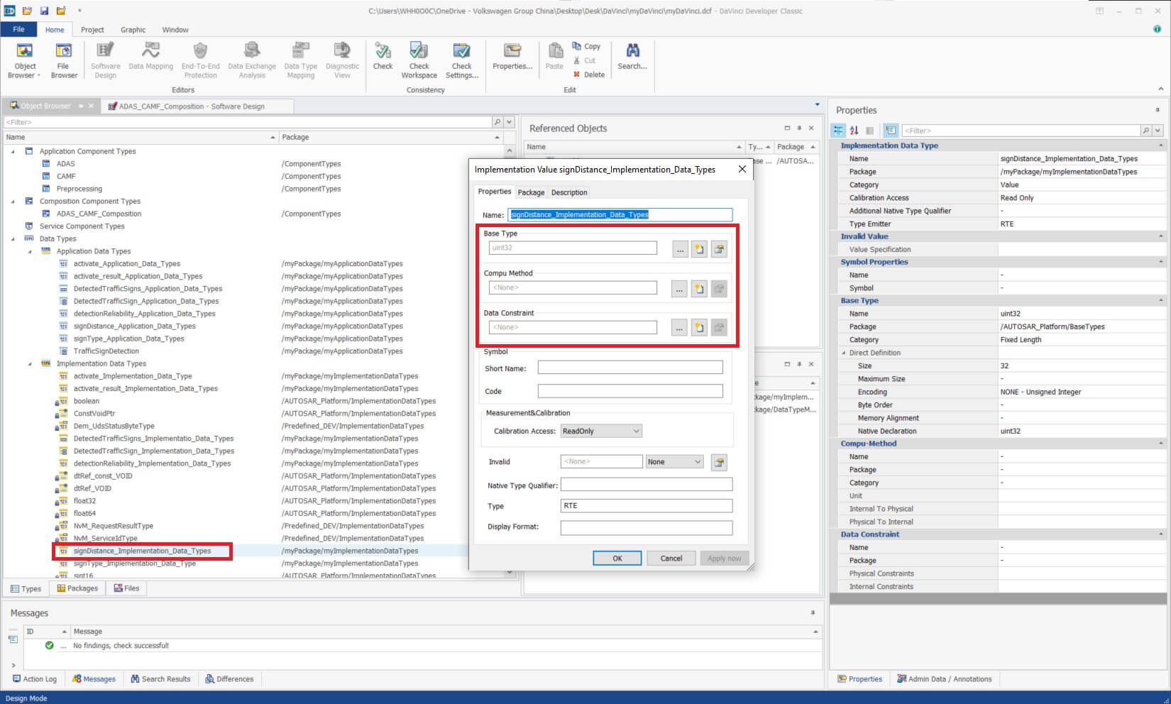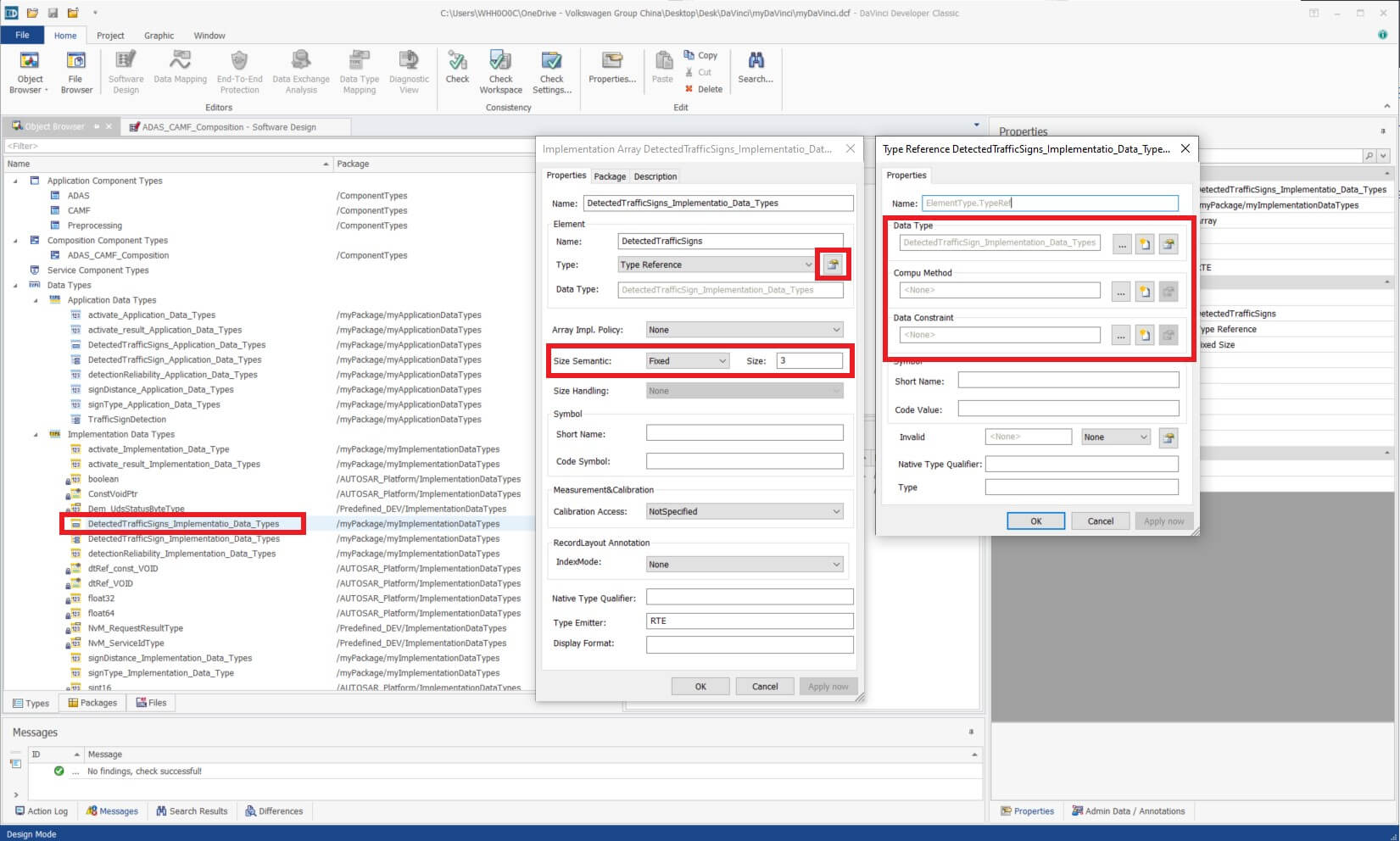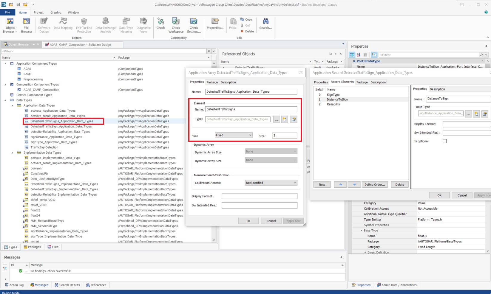 首先DetectedTrafficSigns是一个长度为3的数组,其中数据的类型为DetectTrafficSign,而DetectTrafficSign在DaVinci中是一个Record类型,对应到C语言中是Struct结构体,其中又包括了SignType,DistanceToSign以及Reliability三个元素。点击我截图标识的按钮可以一层一层拆包看到DistanceToSign是使用的我们定义的signDistance的Data Type。