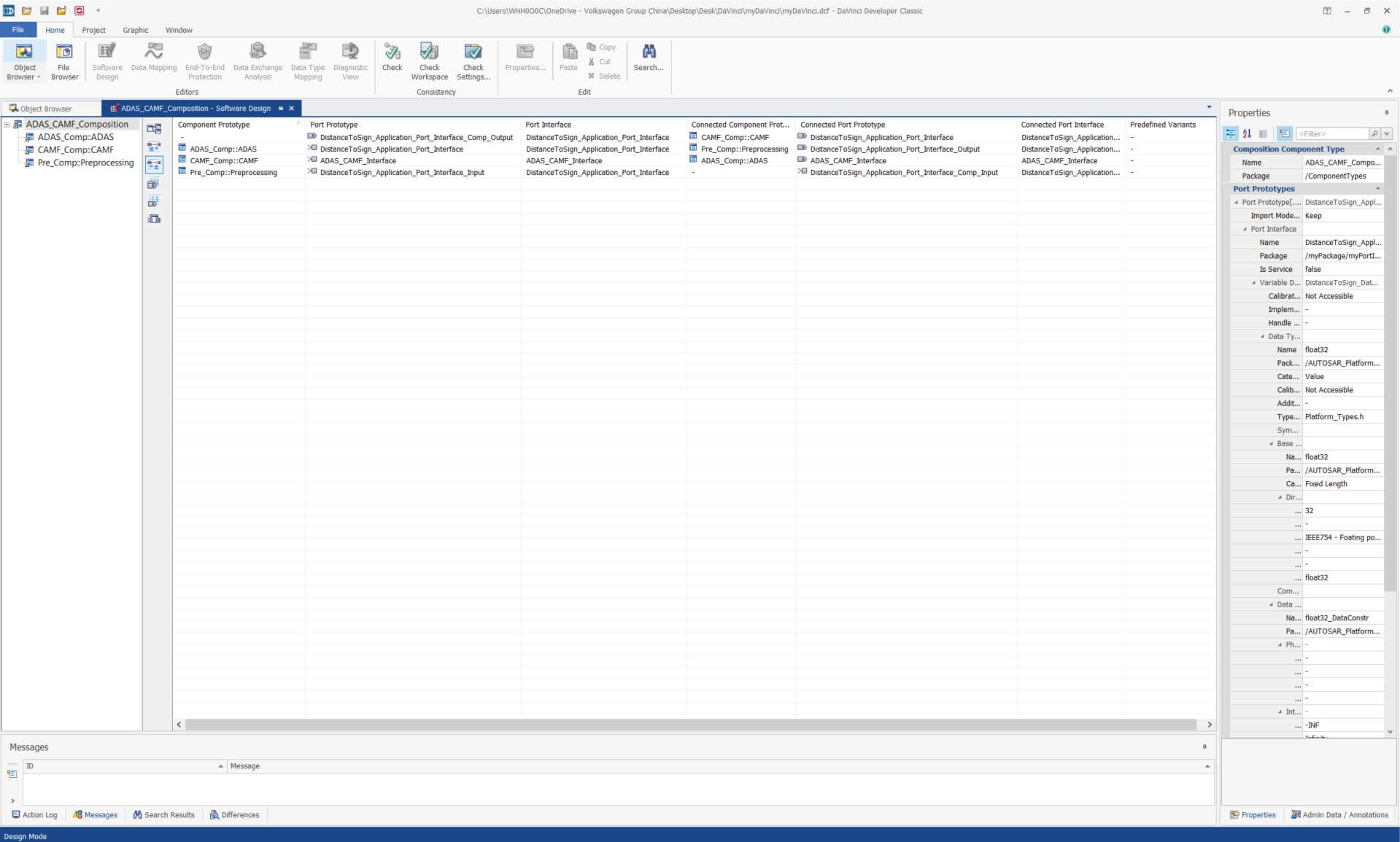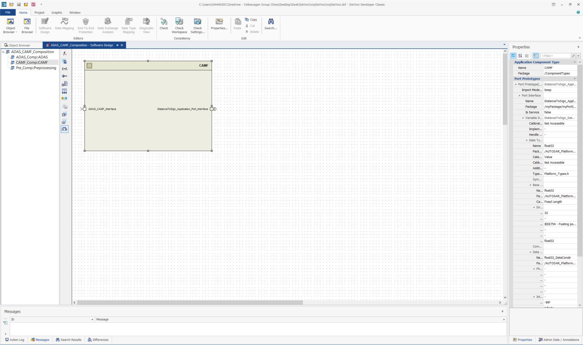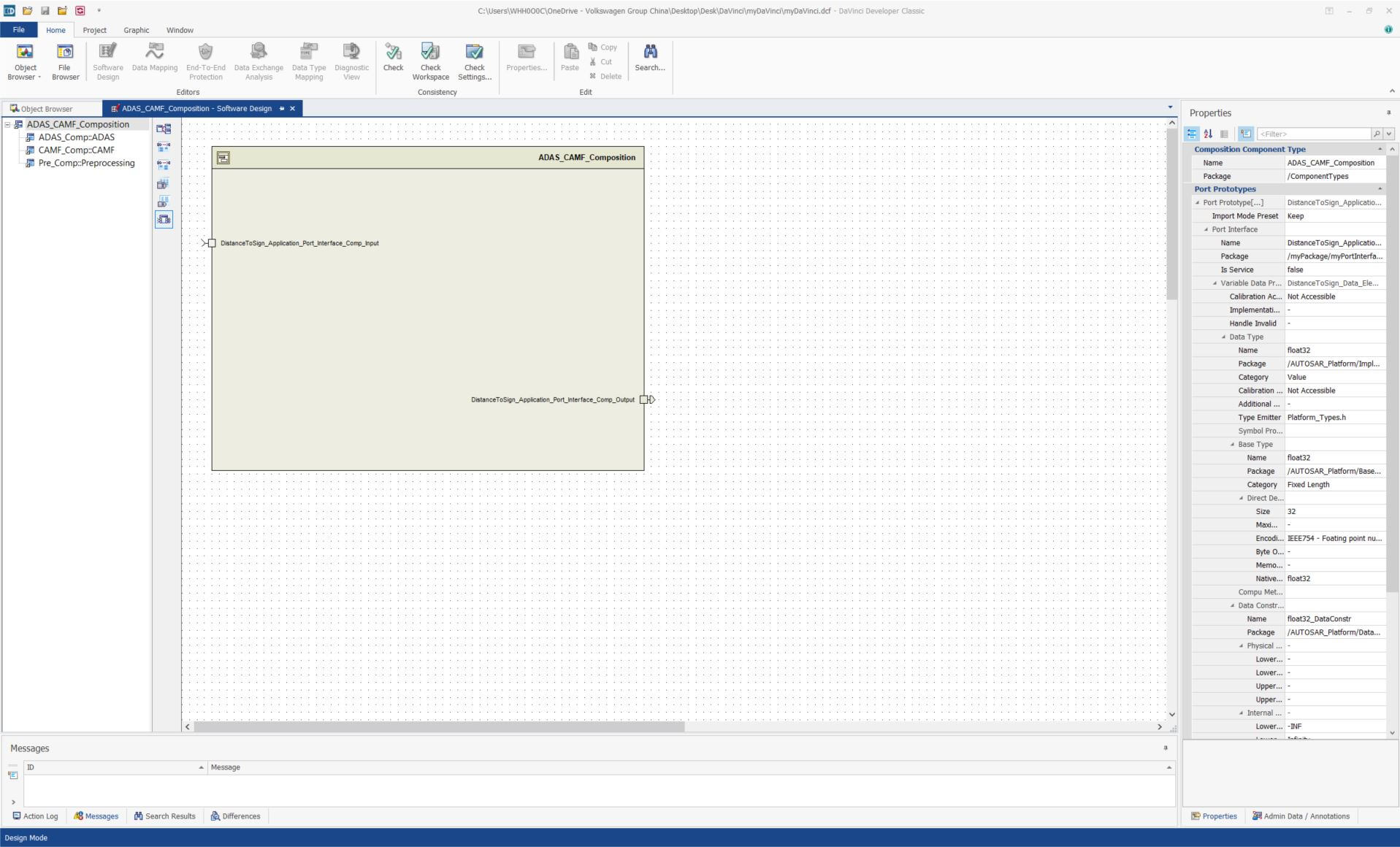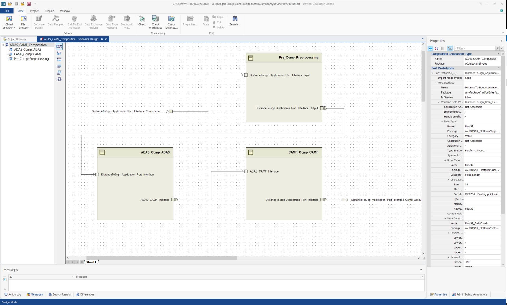 切换在Structure Graphic视图,可以直观看到整个功能里边的模块是信号怎么流传的。我的学习示例中整个功能唯一的输入先送到Preprocessing模块,然后再原封不动透传到ADAS模块,假设再ASAS里我们做了一些处理,然后输出一个TrafficSignDetection结构体到CAMF,再在CAMF里边做一些处理,输出一个DistanceToSign作为整个功能的输出。