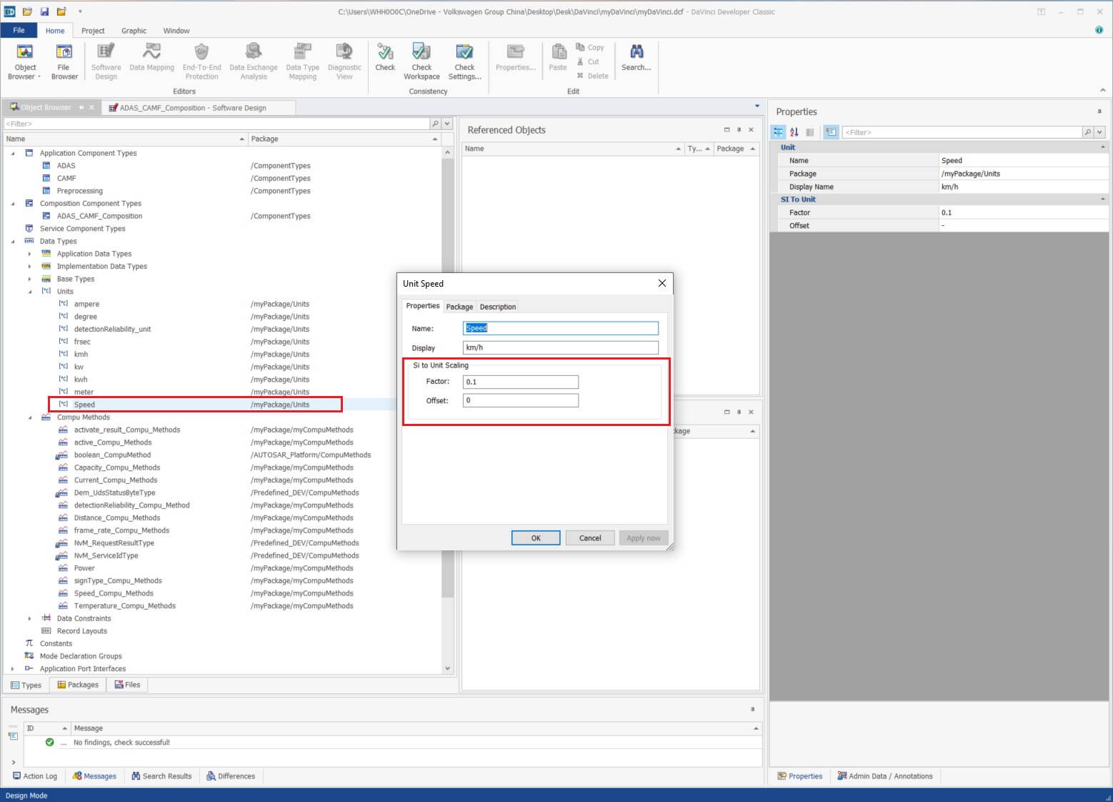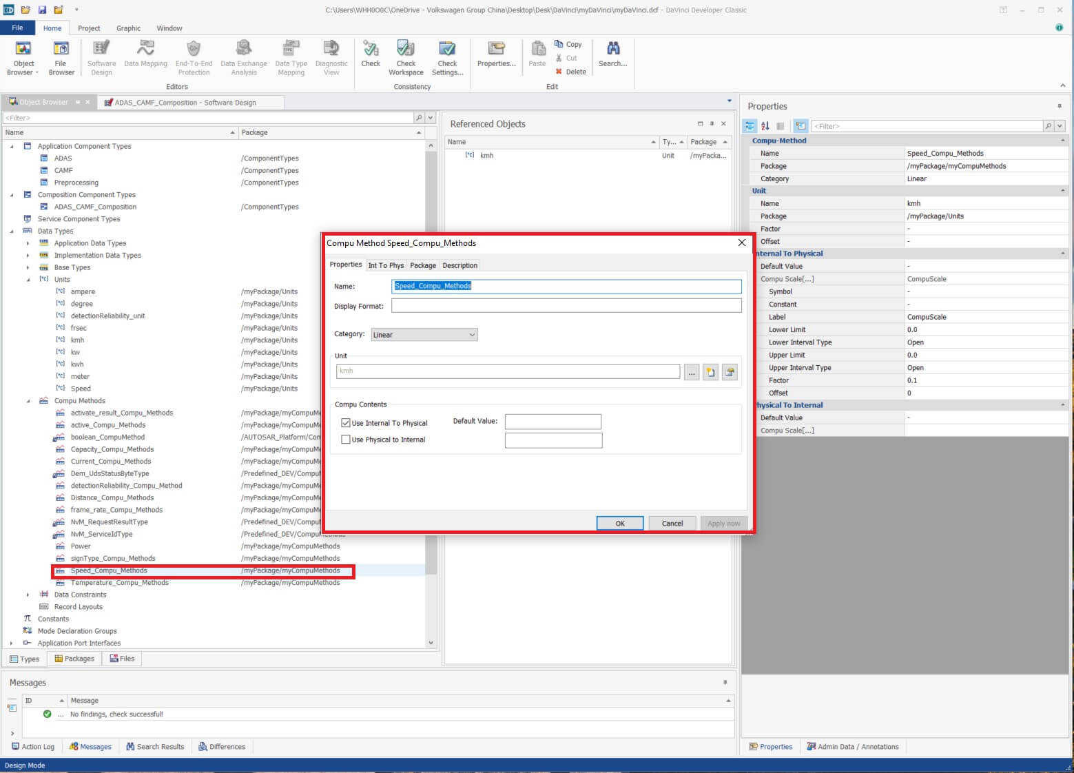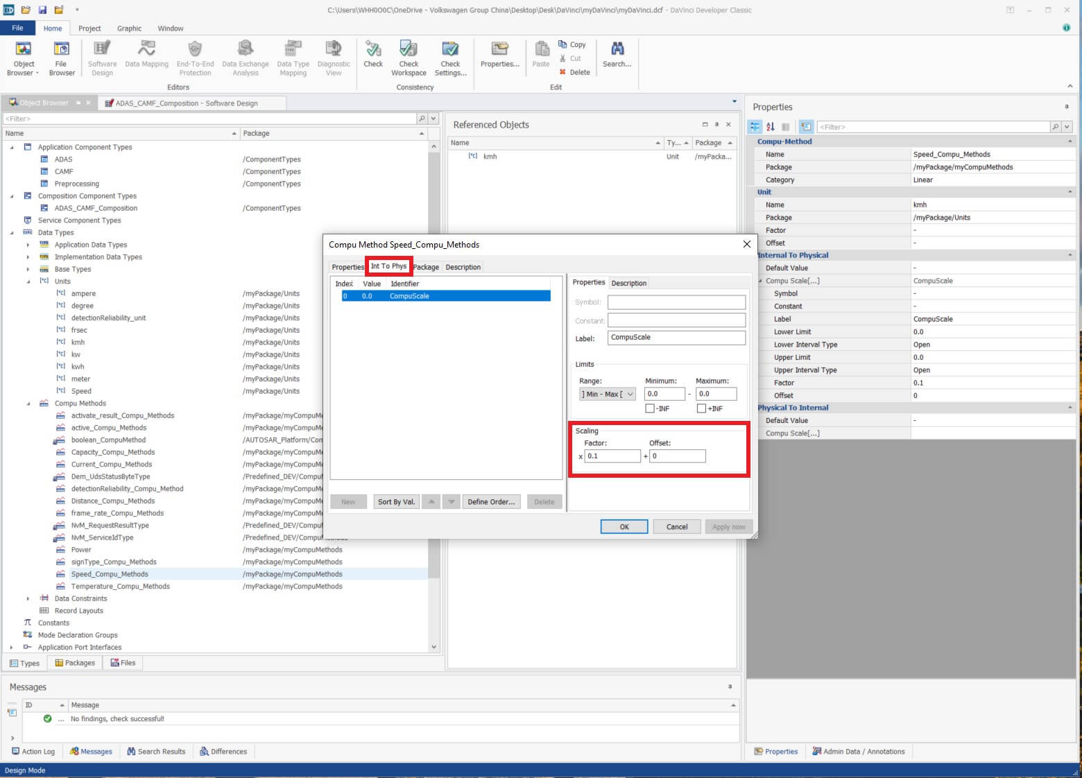 接下来从0开始看下这个例程中数据类型是怎么配置的。以Speed和signDistance为例,下边截图是对于Speed的Unit、CompuMethod 以及 Int To Phys 页面的配置截图。