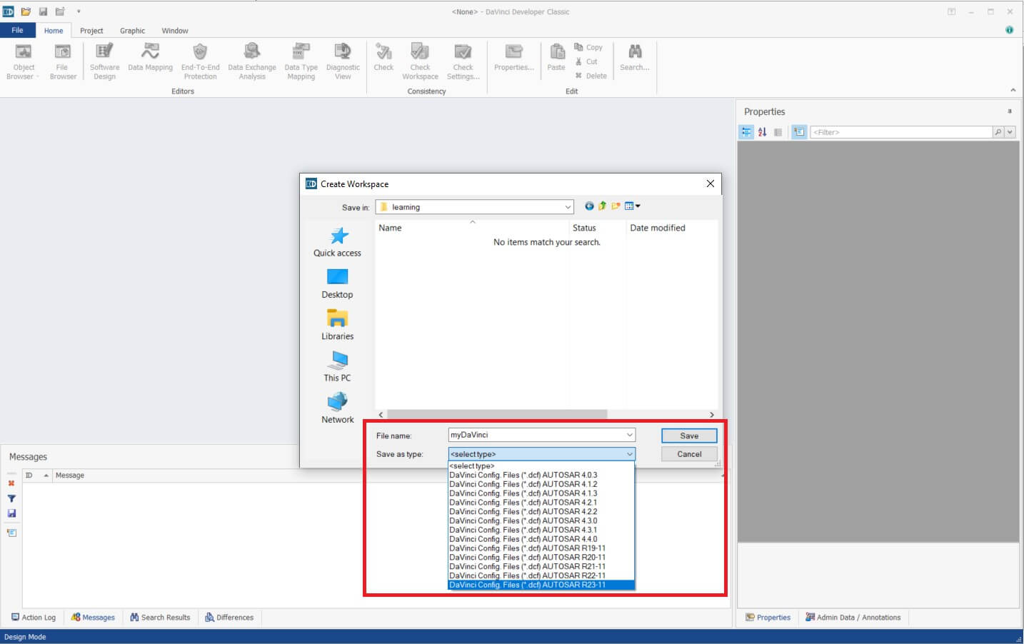 首先在DaVinci Developer中新建一个Workspace,对于要使用的AUTOSAR的版本我选择了最新的,在这儿如果是具体项目使用,就需要和整个项目所用的版本保持一致。从这个下拉框我们也可以看到,对于AUTOSAR版本的定义之前是X.Y.Z的形式,从某一个节点后改成了RYY-MM的格式,现在这种形式感觉直观了很多。