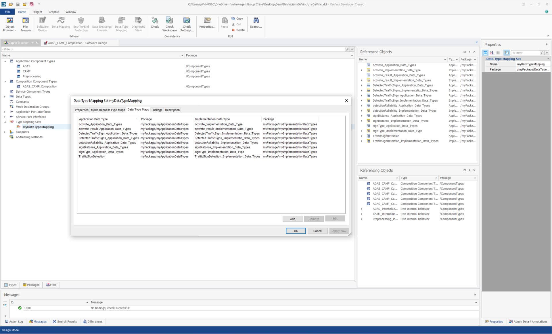 再下来看下怎样将准备好的数据类型,运用到具体的Component的信号里边去的,在DaVinci中有Implementation Data Types (IDT)和Application Data Types(ADT)两种,其中的区别是Implementation 是与具体的硬件以及编译环境有关,只能使用环境支持的数据类型,若要对SWC进行硬件以及环境的迁移这一块需要适配;而Application是完全与硬件无关的,这里我们可以按照我们的需求使用Autosar支持的任意数据类型及其组合。在这两个之间需要走一个映射,这个映射叫做DataTypeMapping。我们在后边会看一下这个示例例程的Mapping配置。