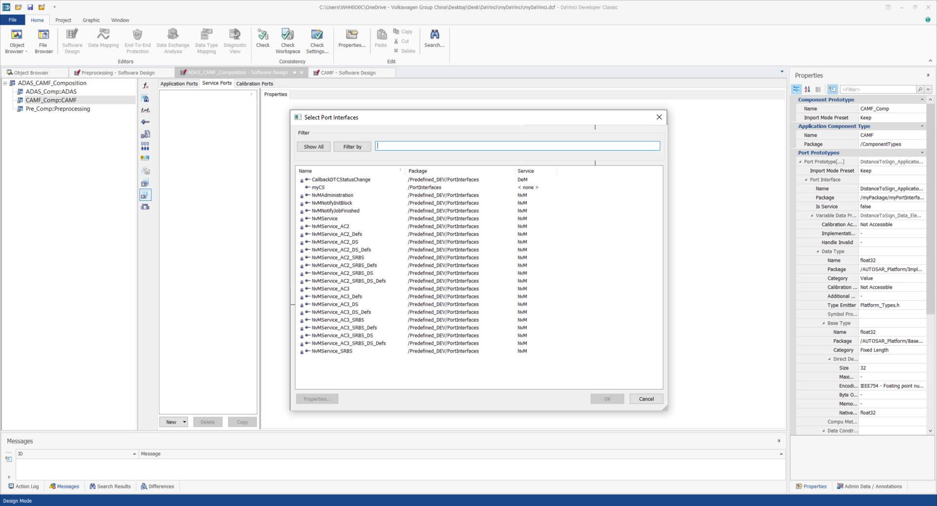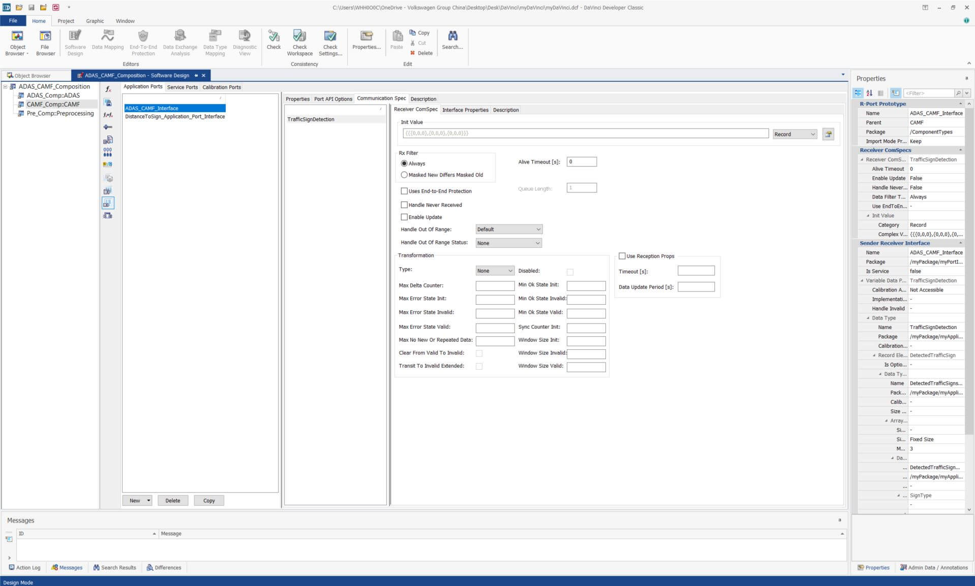 接下来再看下在Component里边信号接口是怎么定义的,以CAMF具体为例,在这个SWC共有两个信号接口,一个是ADAS_CAMF_Interface输入,一个是叫做DistanceToSign_Application_Port_Interface的输出。并且这两个都是Application Ports的类型,并不是Service Ports。主要是的原因是Vector DaVinci Developer主要是设计应用层SWC的接口定义,对于下层系统承载方式是无所谓的。虽然我的期望是这个DetectTrafficSign通过SomeIP在两个ECU模块中传输,但是在SWC层级还是属于Applications Ports。真正的SomeIP承载映射成一个Event Notification是属于DaVinci Configurator 的事情了。