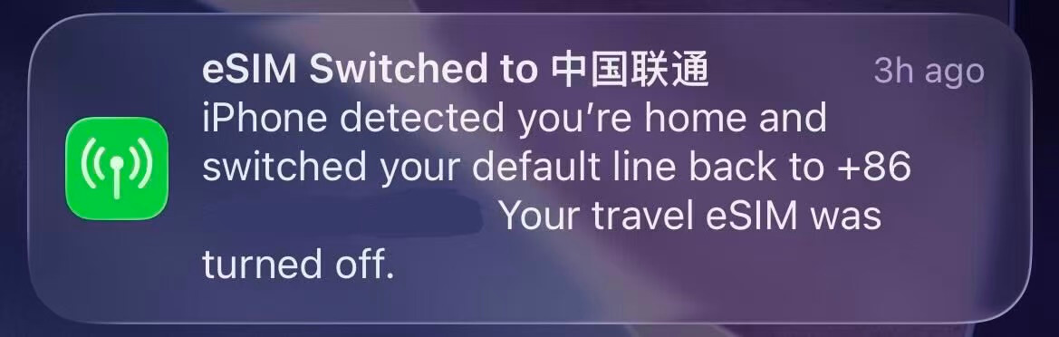 在从香港返回国内关闭飞行模式后,iPhone可以自动识别已经回到了所在国家,然后自动关闭了境外流量卡并且切回主卡作为流量通道使用,全自动完全不需要人工操作。由此想到我们对于eSIM的挖掘可能还远远不够,像前文所说iPhone应该是可以存储8张eSIM卡,结合着自动根据地理位置识别而自动所在国家/地区的卡,无缝切换。举个例子假设一个经常在香港/德国/美国出差的人士,加上中国的手机一共有4个eSIM,然后到达出差国家自动就打开当地的流量卡,虽然只是一个小细节,但是整体来说体验感会非常的丝滑。