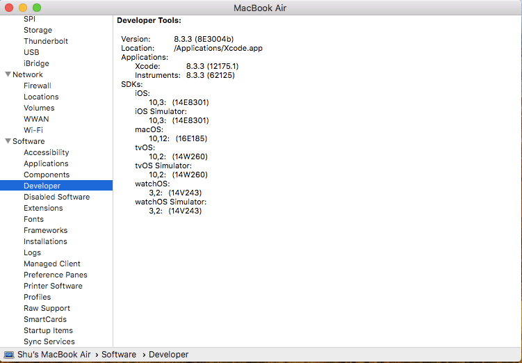 这里看到macOS的SDKs是10.12,我的理解在我这里应该添加的数字是10.12就可以了,因为我安装的是测试版系统,所以可能开发包还是旧版而系统比较超前已经是10.13了,我猜想如果是用正式版系统的普通用户的话这两个版本应该是一样的。我在我这儿将这两个数字都添加到了那两个文件中,你们可以看到就如上图那样。
